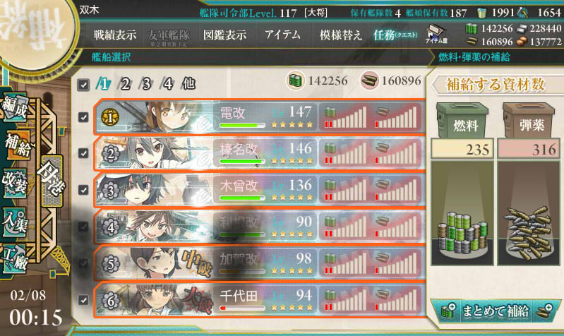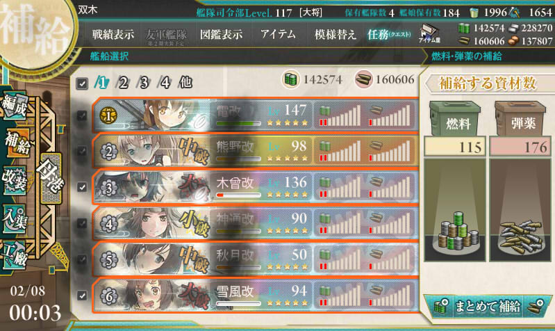 削り時はルート固定要因に舞風と野分のパターンと、那珂ちゃんのパターンで交互に出撃。