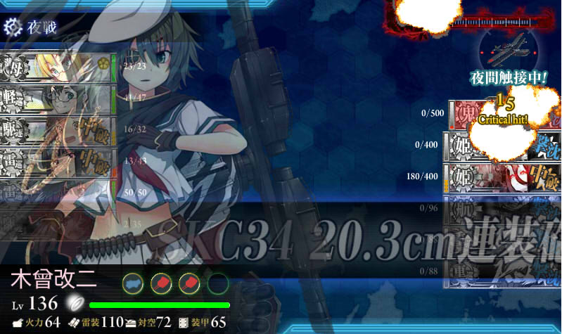 これで道中は戦艦も一撃で仕留めれる火力があり、回避が高いツ級や駆逐後期型も連撃なら落としてくれます。
